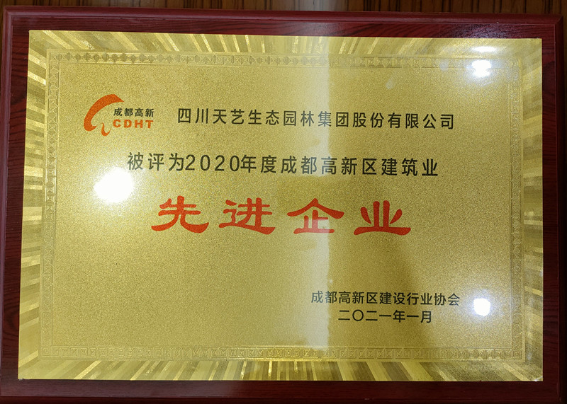 2021年1月28日,成都高新区建设行业协会发布《关于表彰2020年度高新区建筑企业“先进企业、优秀企业家”》的决定,四川天艺生态园林集团股份有限公司(以下简称“天艺生态”)荣获“2020年度成都高新区建筑企业先进企业”称号,天艺生态董事长兼总经理黄远祥荣获“2020年度成都高新区建筑企业优秀企业家”称号。